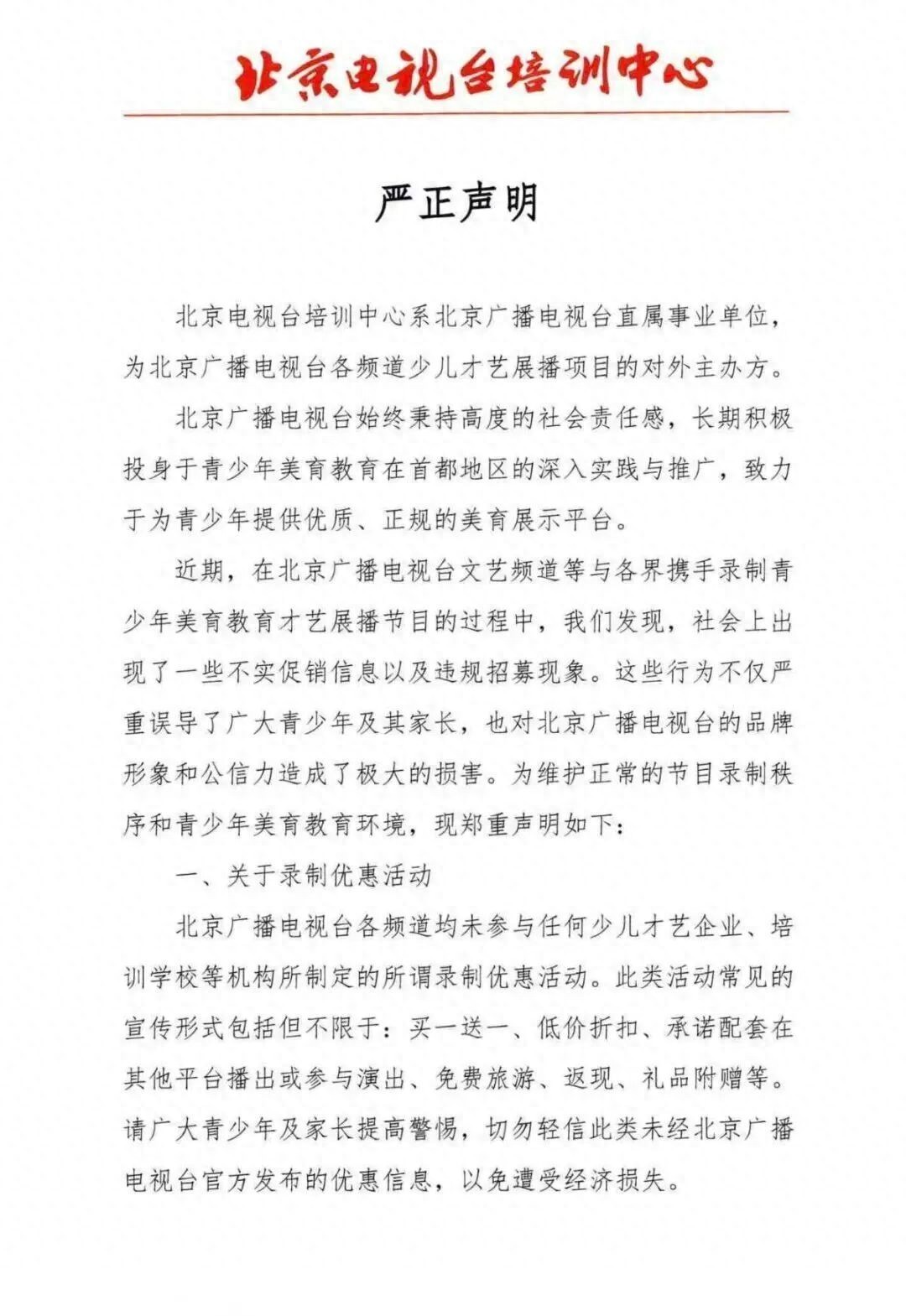 近期,北京广播电视台文艺频道等与各界携手录制青少年美育教育才艺展播节目的过程中发现,社会上出现了一些不实促销信息以及违规招募现象。对此,北京电视台培训中心发布声明:
