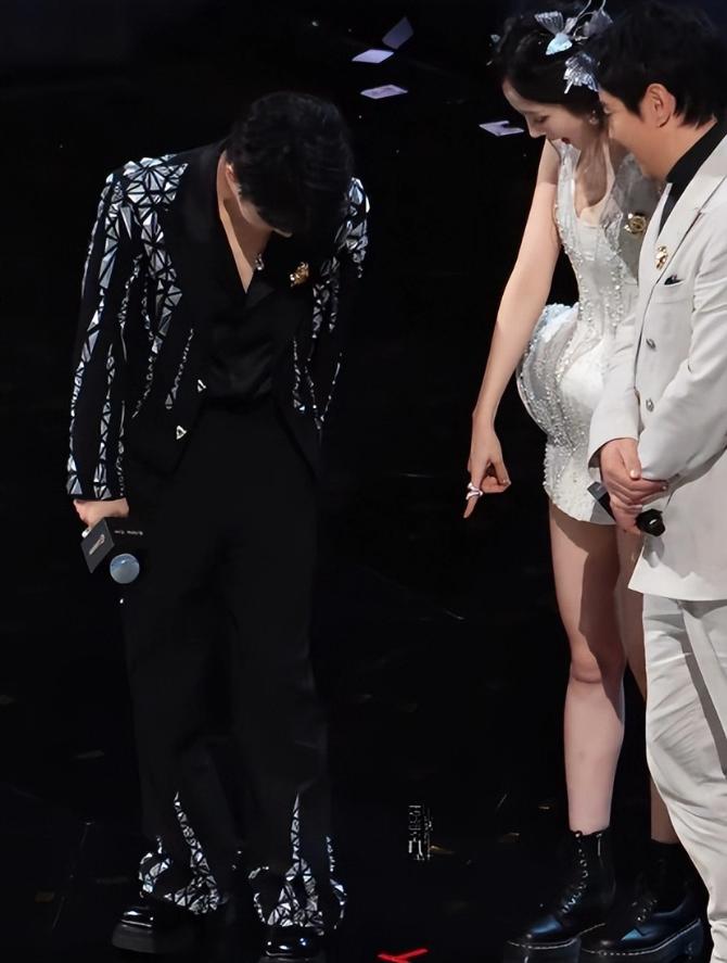 但由于杨幂穿的是短裙,且舞台反光的原因所以没有直接蹲下捡起。